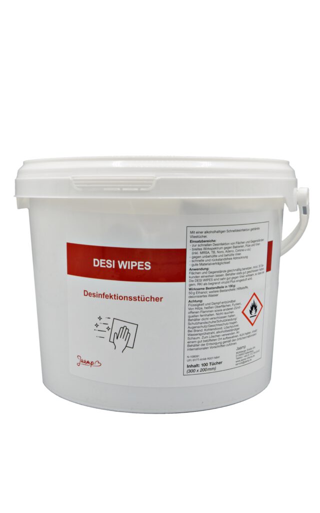 DESI WIPES sind Ihre praktischen, alkoholhaltigen Desinfektionstücher im Spender-Eimer – für die schnelle und zuverlässige Desinfektion von Flächen und Gegenständen.