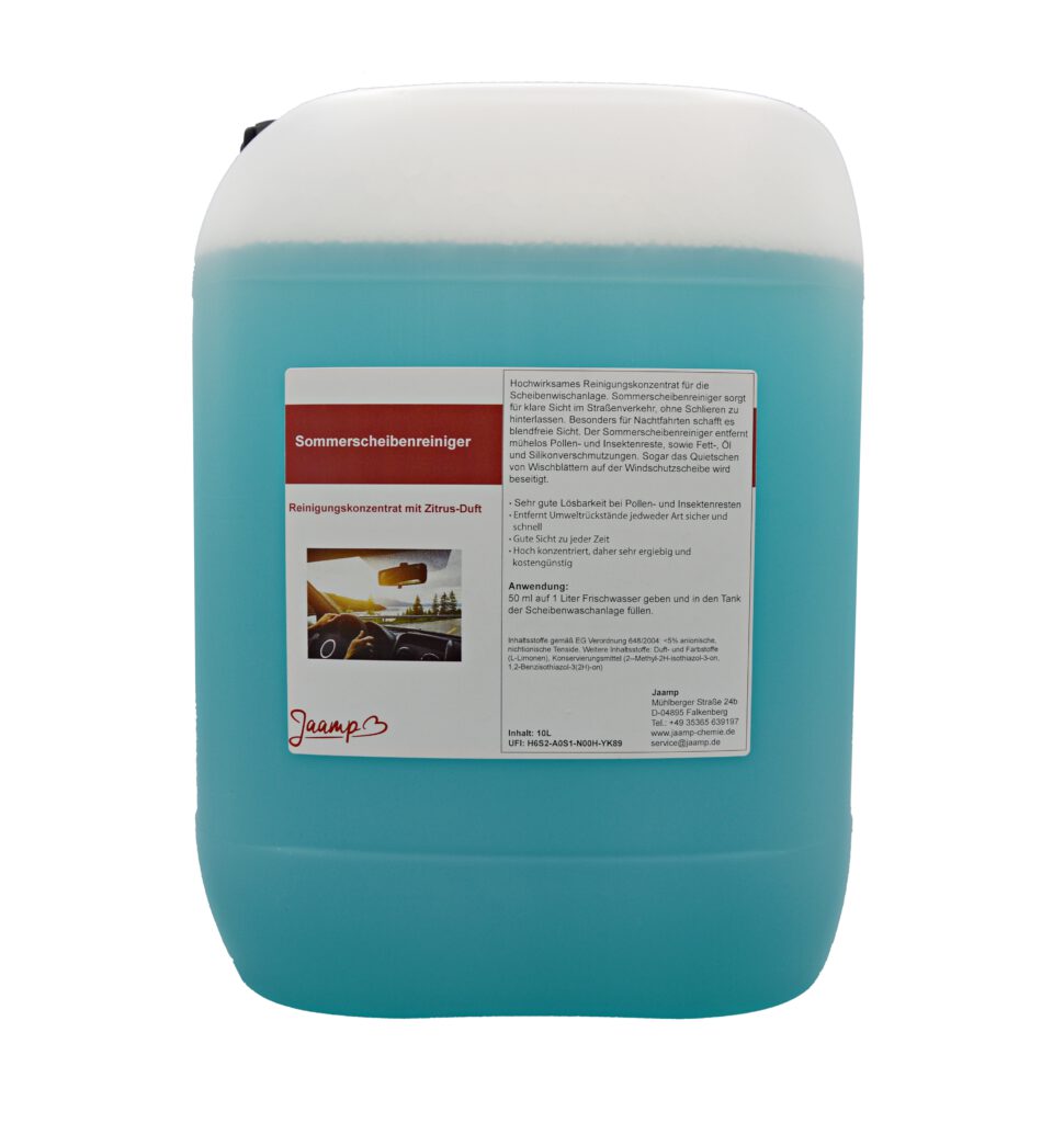 Der Sommerscheibenreiniger mit Zitrus-Duft sorgt für streifenfreie Sicht, entfernt Pollen- und Insektenreste zuverlässig und reduziert das Quietschen der Wischer – ideal für Werkstätten, Fuhrparks und den anspruchsvollen Privatgebrauch. Gern erstellen wir Ihnen ein individuelles Angebot.