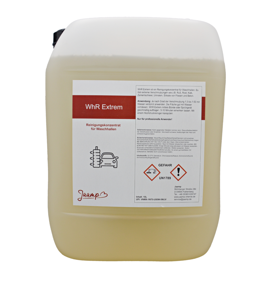 WhR Extrem ist ein Reinigungskonzentrat für Waschhallen. Es löst extreme Verschmutzungen wie z.B. Ruß, Rost, Kalk, Zementschleier, Urinstein, Silikate von Fliesen und Beton.